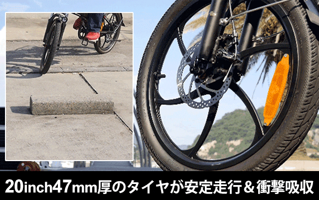 20inch 47mm 厚の太いタイヤが安定した走行はもちろんのこと、