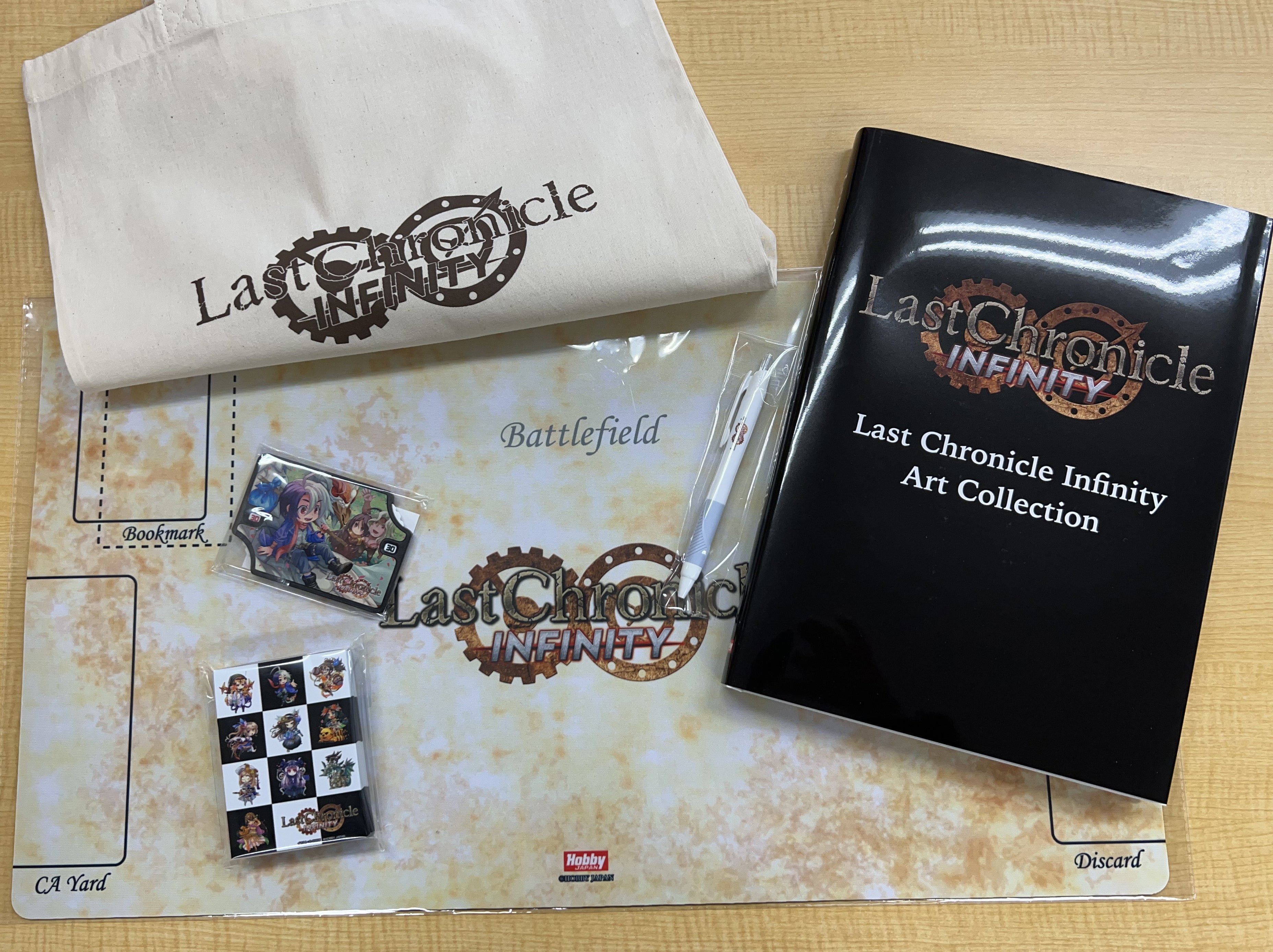 ほか、プレイマット、スリーブ、ライフカウンターに、ストレッチゴール達成の特製「ノベルティセット」 に含まれるロゴ入りボールペン、トートバッグが、サンプルでなく発送用のものが届いております。