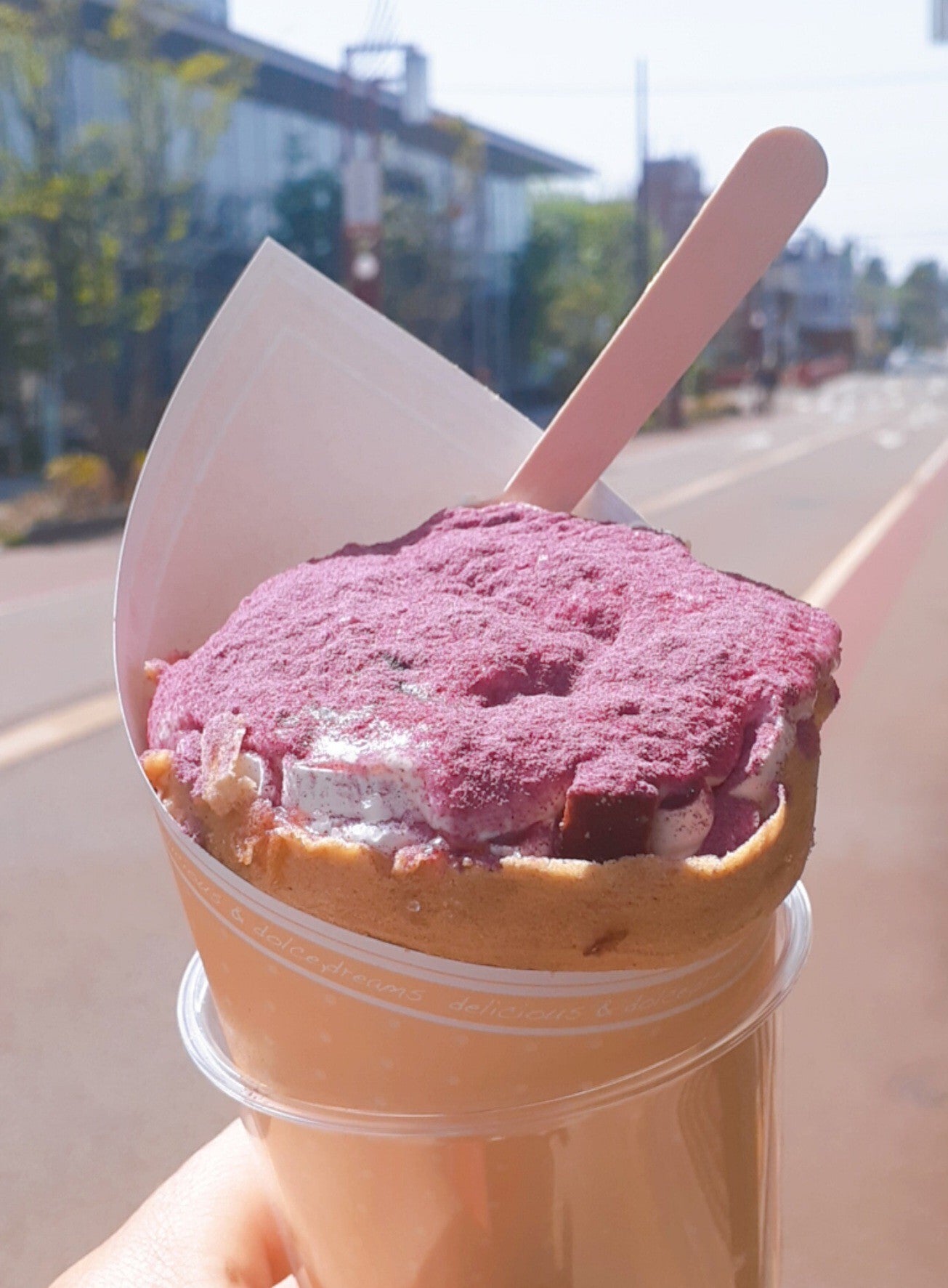 飼い主さんは人気メニューのむらさき芋チーズクレープを注文し、美味しそうに食べていました。