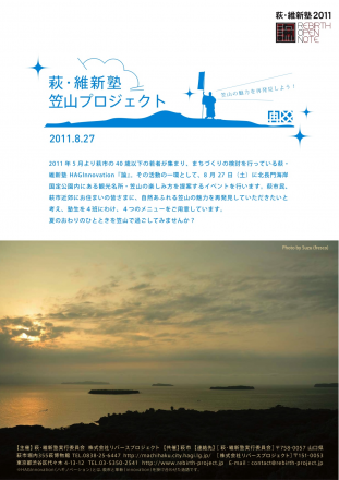 2011/08/17 02:18萩・維新塾×リバースプロジェクトは、2011春より、地域活性化の活動を行っています。8月26日の本イベントは、塾生による27日の「笠山プロジェクト」の連動企画となります。8月27日の笠山プロジェクトの詳細は、下記のURLをコピー&ペーストしてパンフレットPDFデータをダウンロードしてください。www.losh.jp/DL/kasayama_pamf_ryomens.pdf塾生たちが真心をこめて用意した、笠山を楽しむ4つのメニューをお楽しみに!もちろん当日はリバースプロジェクト代表伊勢谷氏に加え、副代表龜石氏などメンバー4名が会場にかけつけます。26日、27日、是非萩の塾生とリバースプロジェクトと萩を楽しみにいらしてください!yayoi もっと見る