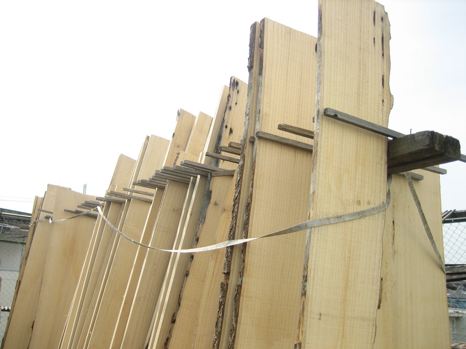 桐の木を当社は丸太のまま仕入れ、製材した桐材を約1年天日干しを行い雨にあてて灰汁(あく)抜きと乾燥させた材料を桐たんすや米びつなどに使います。