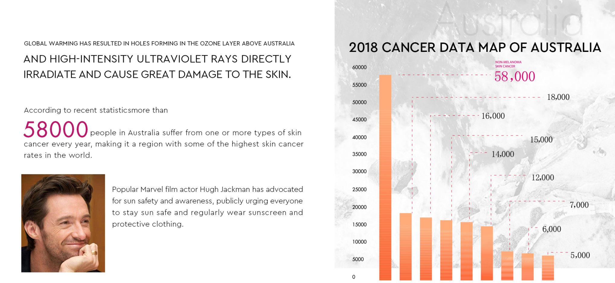 オーストラリア人は幼い頃から太陽から身を守るように教えられていますが、強烈な光によって今でも世界で最も皮膚病の発生率が高い国のひとつとなっています。統計によると、オーストラリアでは毎年58,000人以上の人が1つ以上のタイプの皮膚がんを発症しています。また、オーストラリアは世界で唯一、魚でも皮膚がんになることがある国と言われています。