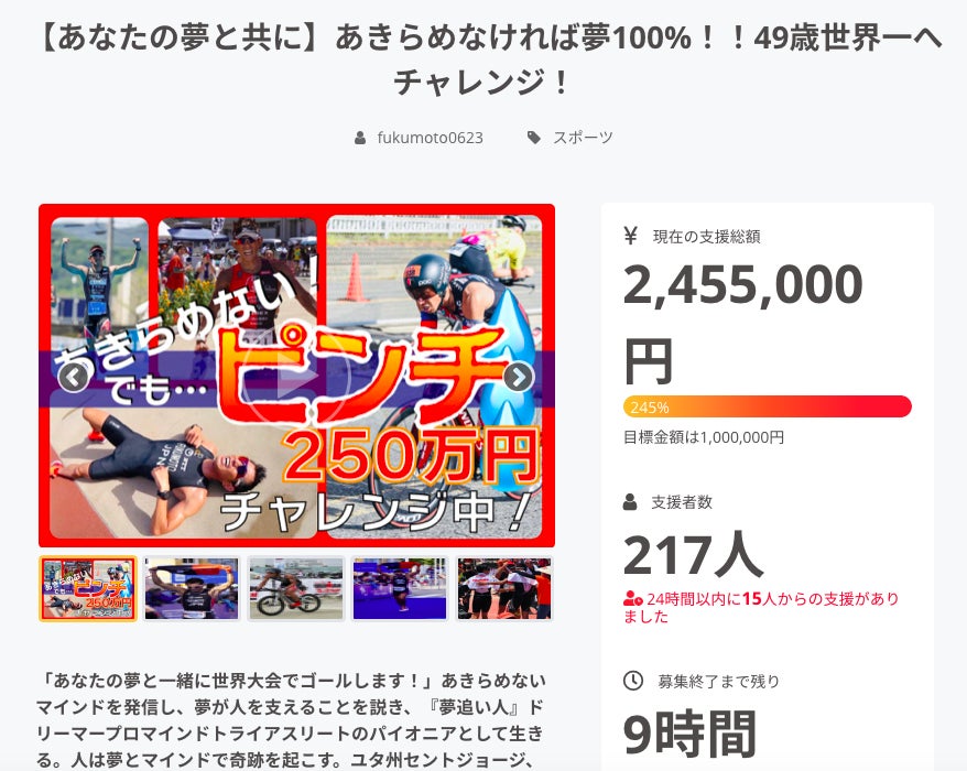 2021/08/30 12:56残り1日となりました!!コロナ禍での影響で急遽必要となった費用について投稿したところ、沢山の沢山の皆様が支援をしてくださいました。こんなに心強く、世界大会へ向けて一緒にチャレンジする仲間が存在することに感謝ばかりです。 202人の皆様、改めて心より感謝申し上げます。 目標金額250万円まであと「198,000円」まで来ました!信じられません‼︎ クラウドファンディングは8月31日23:59までとなります。リターン完売した”スペシャルトレーニング”を追加しています。こちらは、ご希望にそって「ラン・バイク・スイム」お好きなトレーニングをテツローがさせていただきます。ご質問やご要望いただければお答えします!!残り、1日!!全力で走り続けます!【あなたの夢と共に】あきらめなければ夢100%!!49歳世界一へのチャレンジ!https://camp-fire.jp/projects/view/460398Dreamerプロマインドトライアスリート福元テツロー もっと見る