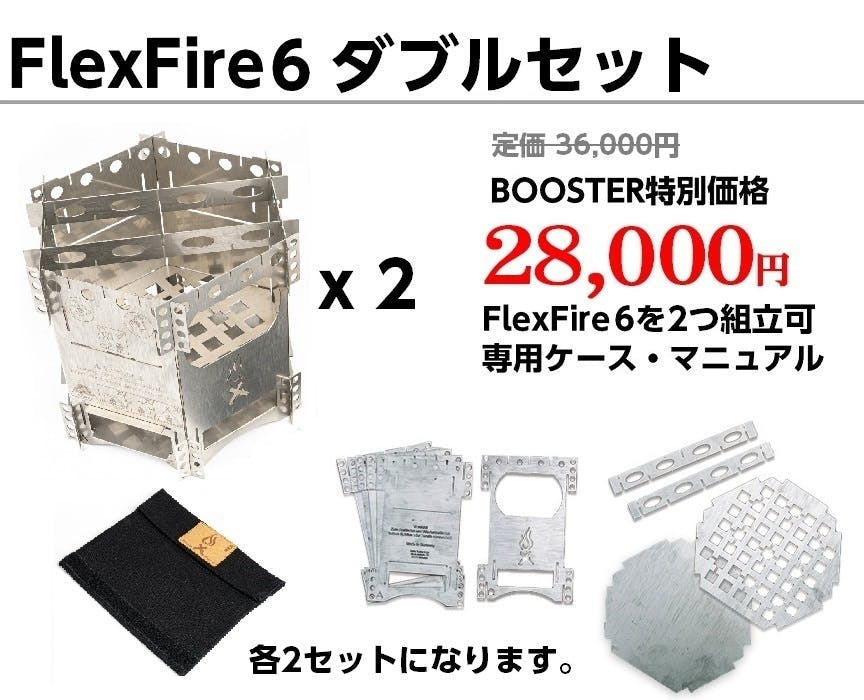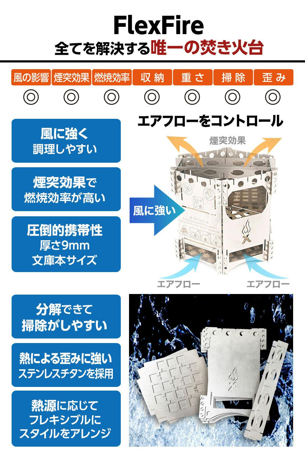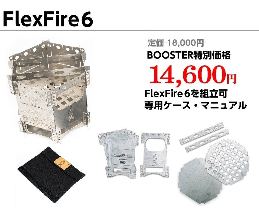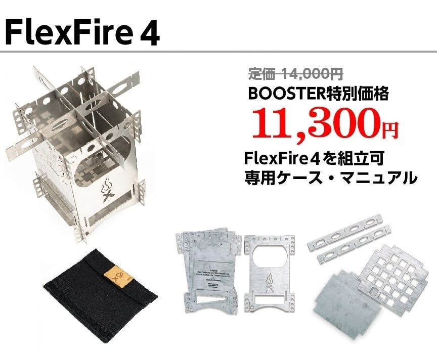 2021/08/30 00:09明日で最終日となります。ご検討されていらっしゃる方は、これからのアウトドアシーズンに是非ご活用いただければと存じます。本日はFlexFireの使用パターンをいくつかご紹介します。1.アルコールストーブ FlexFireはTrangia社と仕様を調整しており、Trangia製がピッタリ収まるデザインになっています。また、ベースプレート(燃焼プレート)を上にあげてアルコールストーブをおいてもかまいません。2.ガスバーバーナーガスバーバーナーをご利用の方は、バーナー部分のみをベースプレートに載せる方法と、風が強い場合、風防としてFlexFireの中に設置することも可能です。FlexFireの中に設置する時は、風通しがよく熱がこもらない状態でご使用ください。長時間の連続燃焼は避け、ガスボンベの過度の過熱にご注意ください。FlexFireは組立方をアレンジできる唯一のキャンプストーブです。皆様のアイディアで色々な使い方をお楽しみいただければ幸いでございます。ソロキャンプのスタンダードFlexFireプロジェクト もっと見る