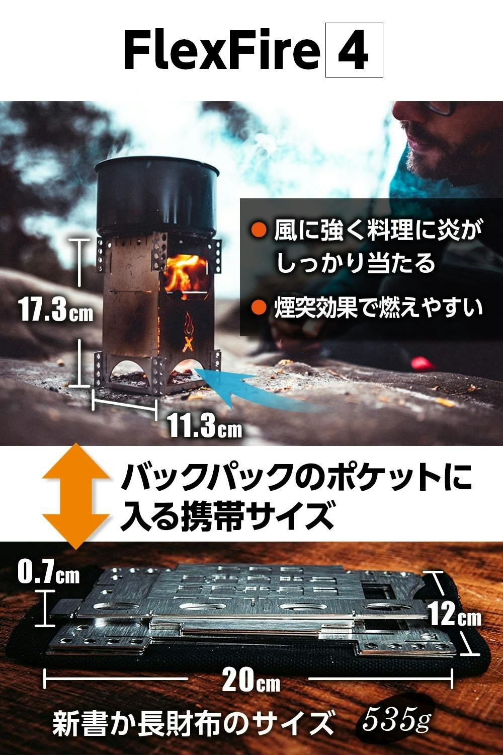 最もコンパクトなFlexFire、新書サイズで7mmの薄さ。重さ535g約ペットボトル1本分です。軽装備のソロキャンプやトレッキングでの携帯に向いています。
