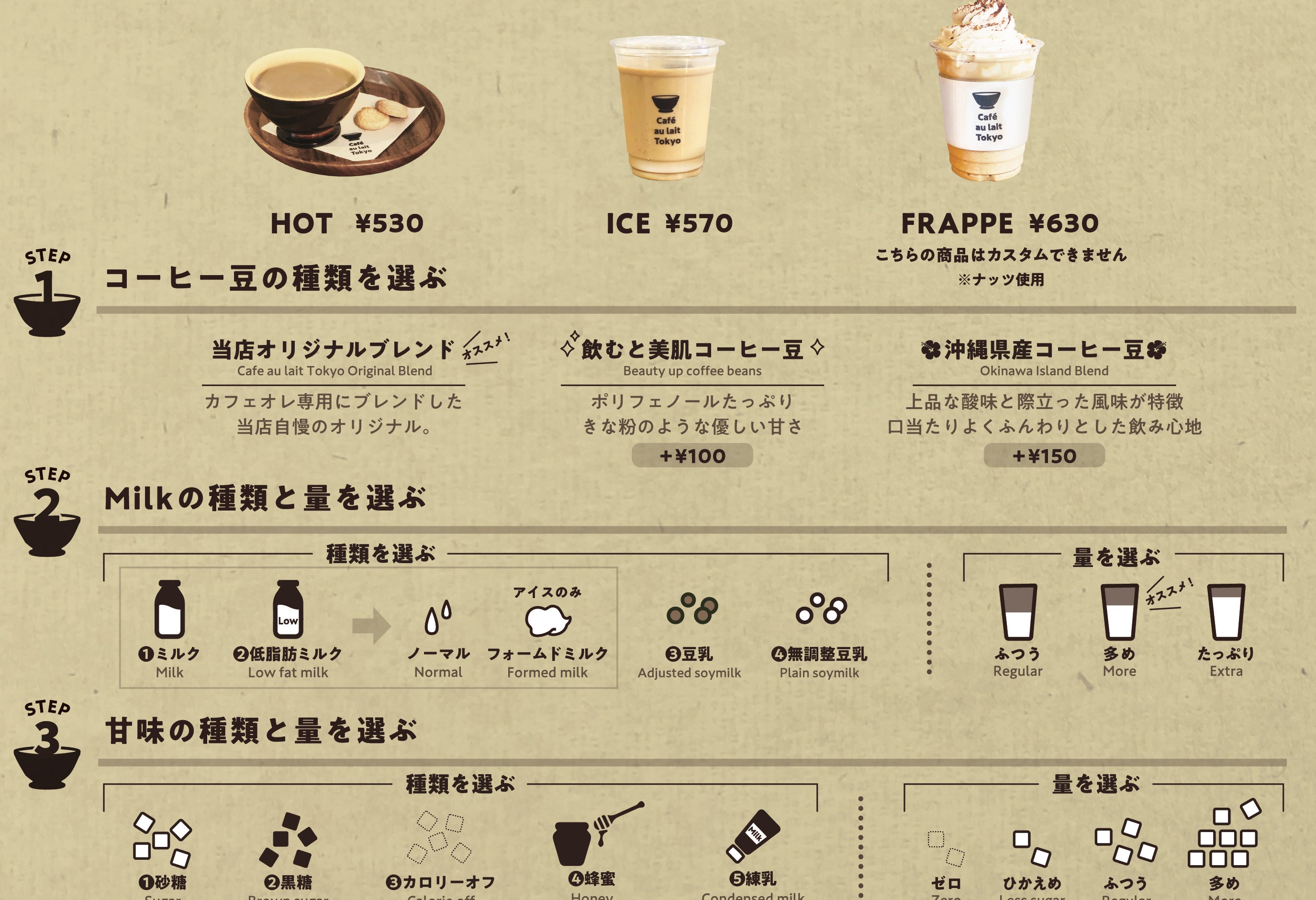 Cafe au lait Tokyoでは、ミルクや甘味の種類や量、コーヒー豆の種類、タピオカやホイップなどのトッピングまで、なんと1000通り!?以上の組み合わせから、自分の好きなカフェオレにカスタマイズすることができます!