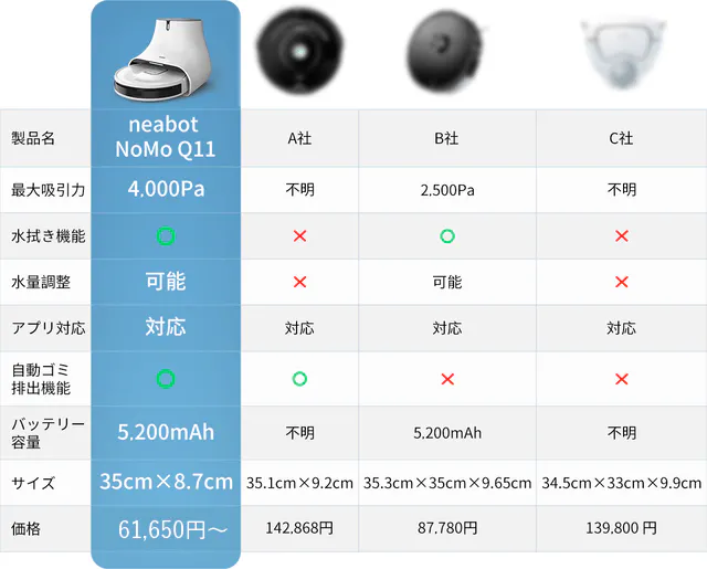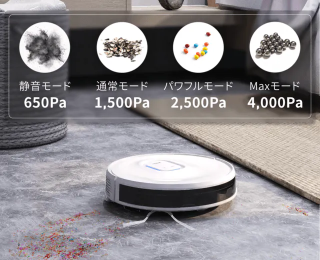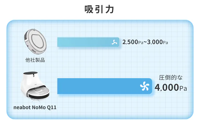 掃除機の命とも言える吸引力! 市販のロボット掃除機の最大吸引力は、一般的に2,500Pa〜3,000Pa程度のものが多いですが、neabot Q11はその中でもトップクラスの4,000Paの吸引力を実現しました。