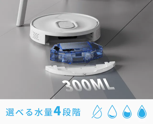 水タンクは300mLの大容量で、1回の給水でなんと最大110畳分をきれいに!また水量は汚れ具合やお好みに応じて、水なし/少なめ/普通/多めと4段階に調整できます。毎日ピカピカで心地良い床でくつろぎませんか?