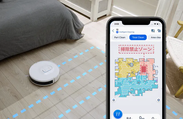 特定のエリアを「掃除禁止ゾーン」として設定することも可能です。その場合、選択されたエリアを避けてお掃除をしてくれます。大事なインテリアやカーペットを傷つけることなく、安心してお掃除を任せられます。