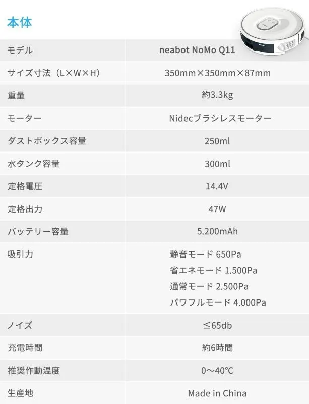 neabot Q11は、日本老舗メーカー日本電産 (Nidec)社の高性能静音ブラシレスモーターを採用し、高品質で高い耐久性を誇ります。