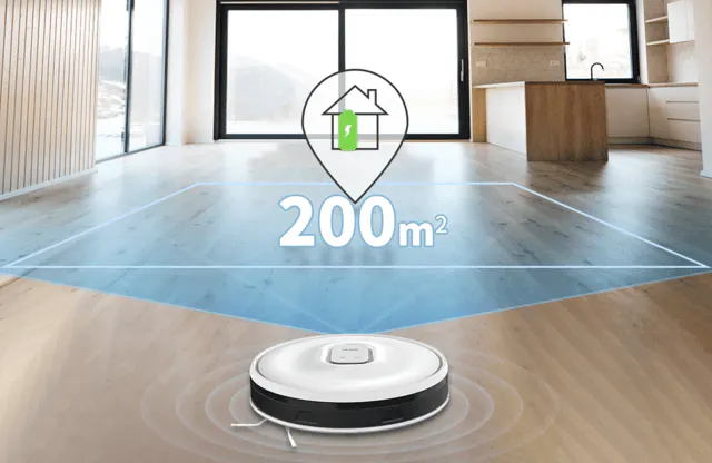 5,200mAhの大容量バッテリーを搭載したneabot Q11は、1回のフル充電でおよそ200平方メートル(=約110畳)を掃除することが可能です。何度も充電ボックスに行き来する必要がありません。