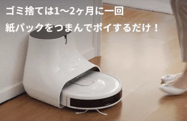 A2:掃除が終わると、自動的に充電ボックスに戻り、ゴミを紙パックに排出します。また、ゴミ排出の頻度はアプリでも設定することが可能です。
