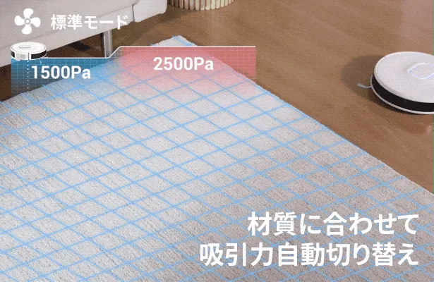 neabot Q11は絨毯エリアに入ると、カーペット識別機能により自動で吸引力を2,500Paまで引き上げ、絡みやすく取れにくいペットの毛や、繊維に付着したゴミをグイグイ吸い取ってくれます。