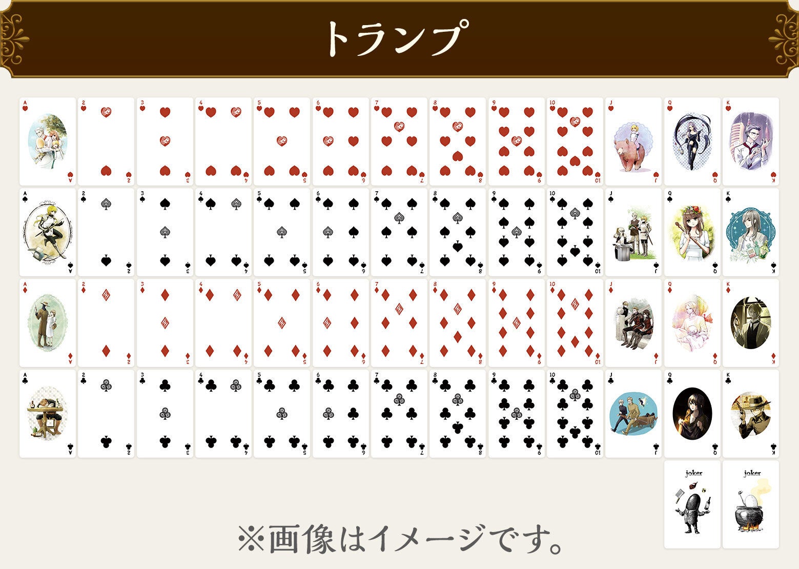 ┗「1」「J」「Q」「K」「JOKER」に九目先生描き下ろしイラストを使用した特製のトランプをご用意します。※トランプは一般的な紙製ブリッジサイズ(約57mm×約89mm)となります。
