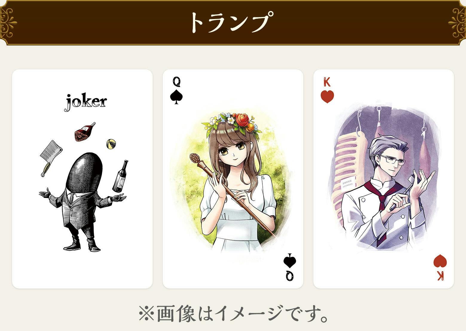 ┗「1」「J」「Q」「K」「JOKER」に九目先生描き下ろしイラストを使用した特製のトランプをご用意します。※トランプは一般的な紙製ブリッジサイズ(約57mm×約89mm)となります。