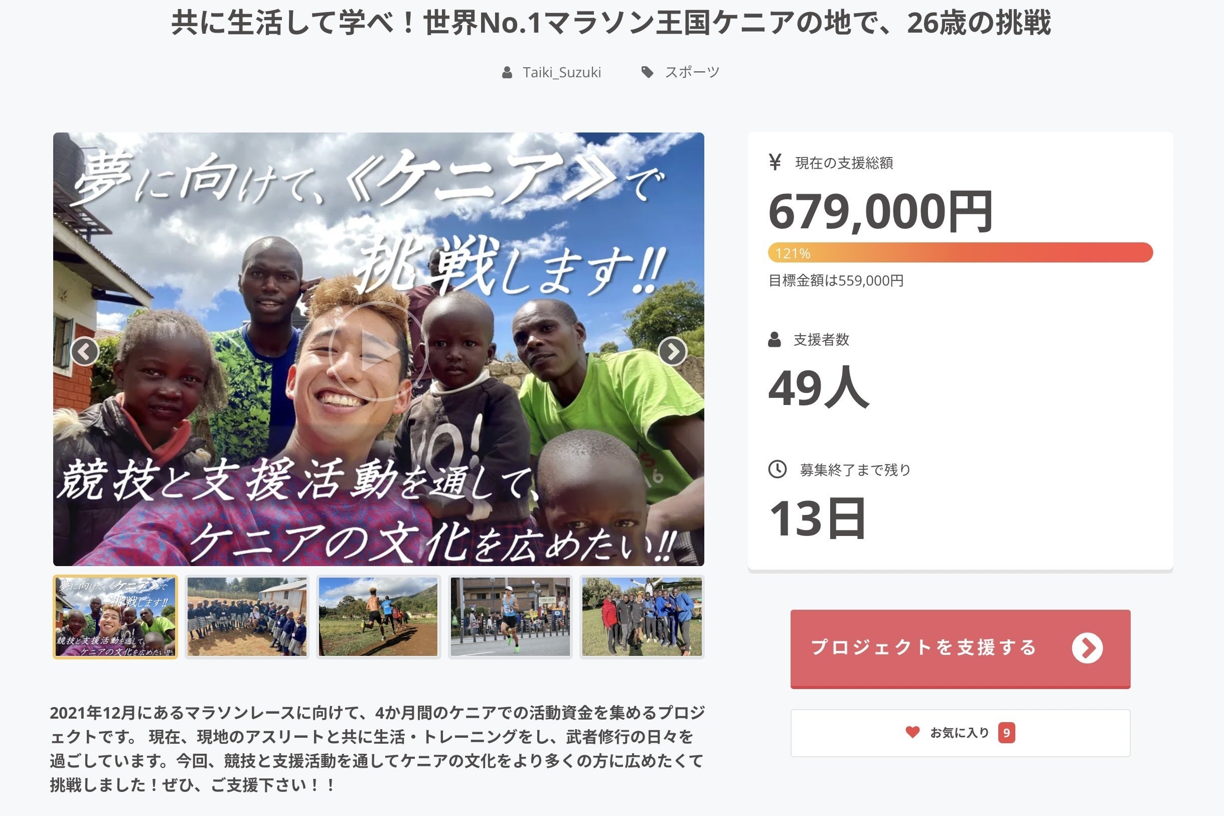 今年1月に、これまで3年半所属していた実業団を退社し、1月からマラソン大国であるケニアを拠点に、プロランナーとして挑戦することを決断しました。現在は、過酷な環境でのトレーニングを積み、世界トップ選手を目指し、武者修行の日々を過ごしています。そこで今回は、ケニアでのトレーニングの成果を試す、12月のマラソンレースに向けての、現地での活動資金を、皆さまにサポートしていただけると幸いです。