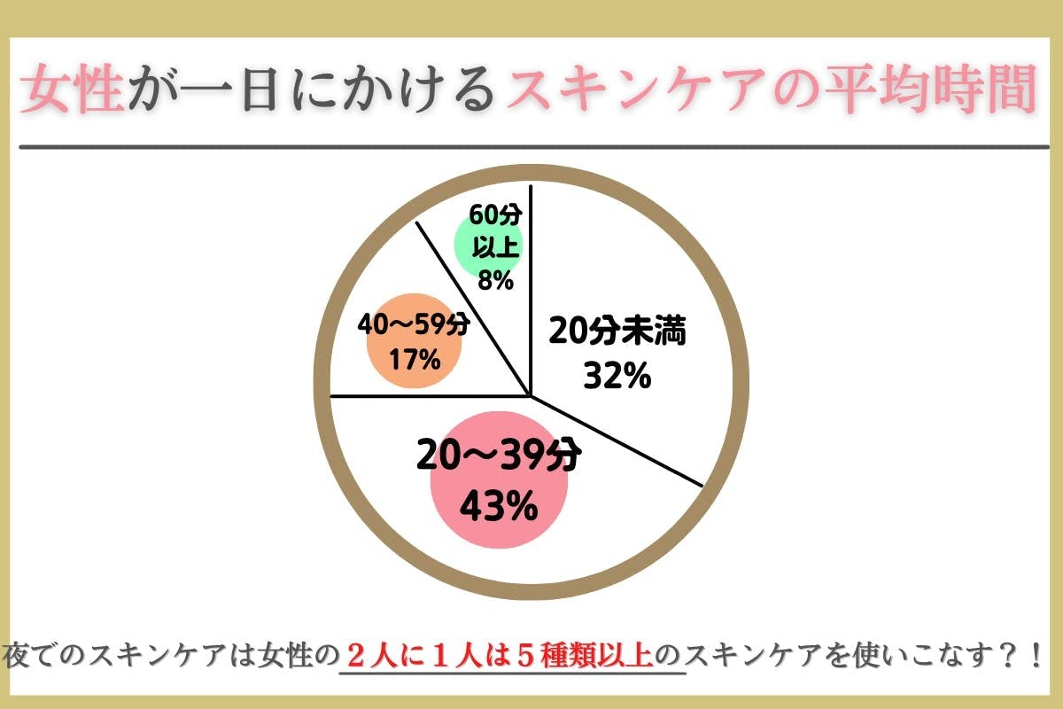 私たちは一日に何分自分のお肌と向き合っているのでしょうか?とふと考えた時に平均で一番多いのが20分〜39分肌ケアに時間をかけていることが分かりました。更にスキンキアの種類は2人に1人は5種類以上のスキンケアを使いこなすんです!