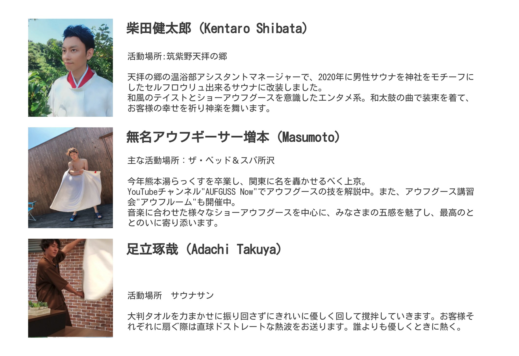 だからこそ、今までになかったアウフグースフェスを開催し、最高のアウフグースの体験をお届けしたいです。その結果、アウフグースの認知度向上や全国の熱波師の方の社会的立場の向上ができたらと思い、今回のアウフグースフェスを考えました。