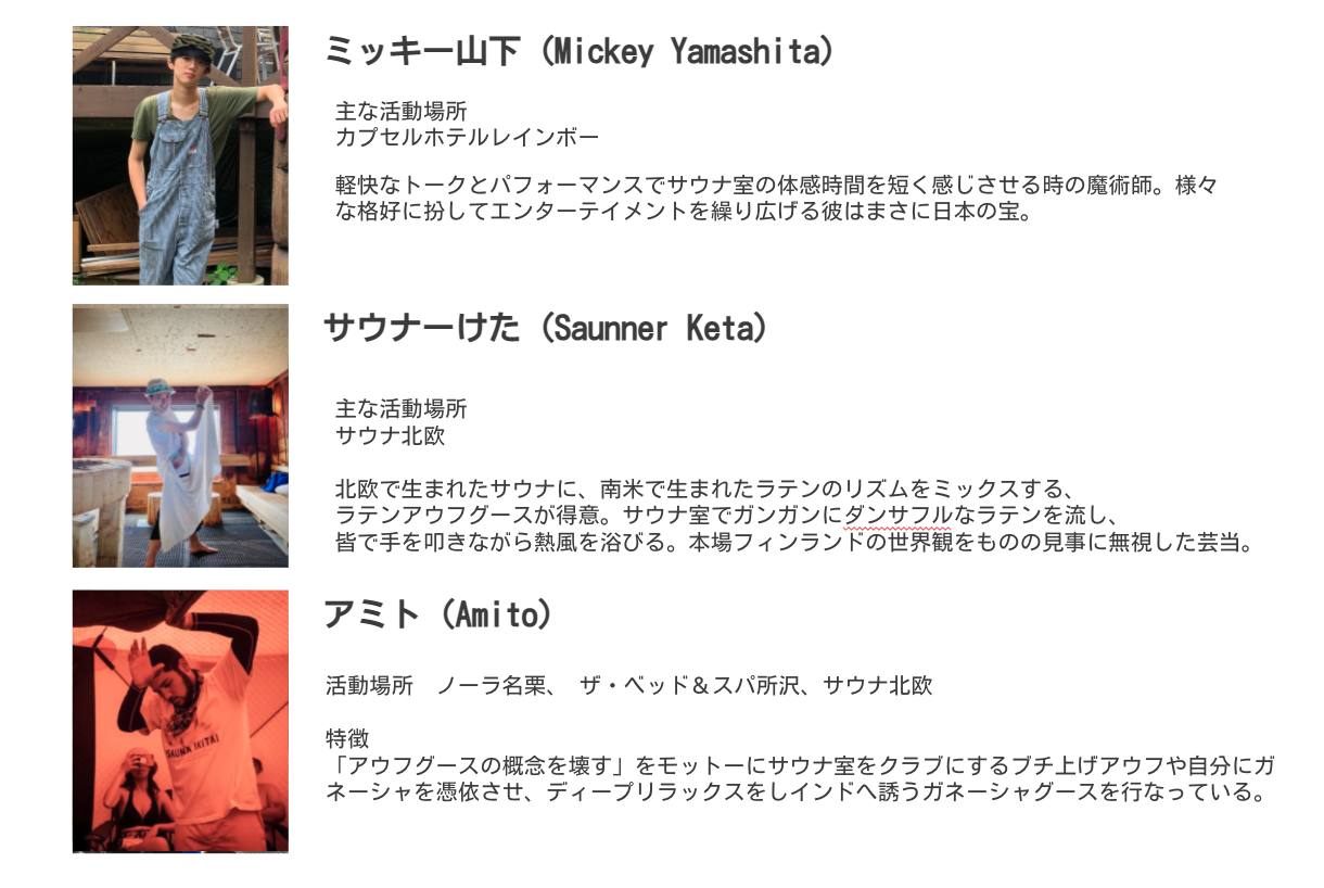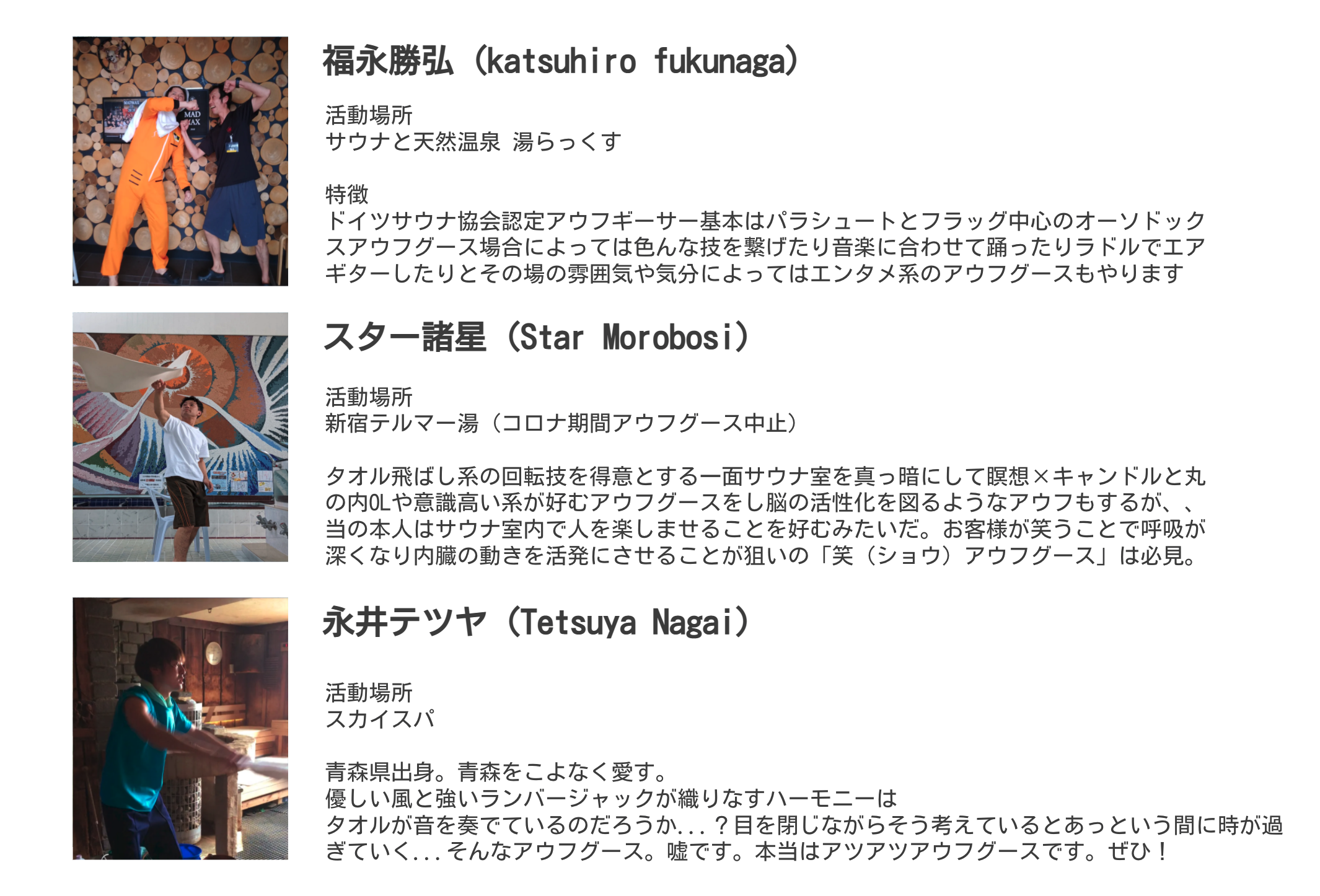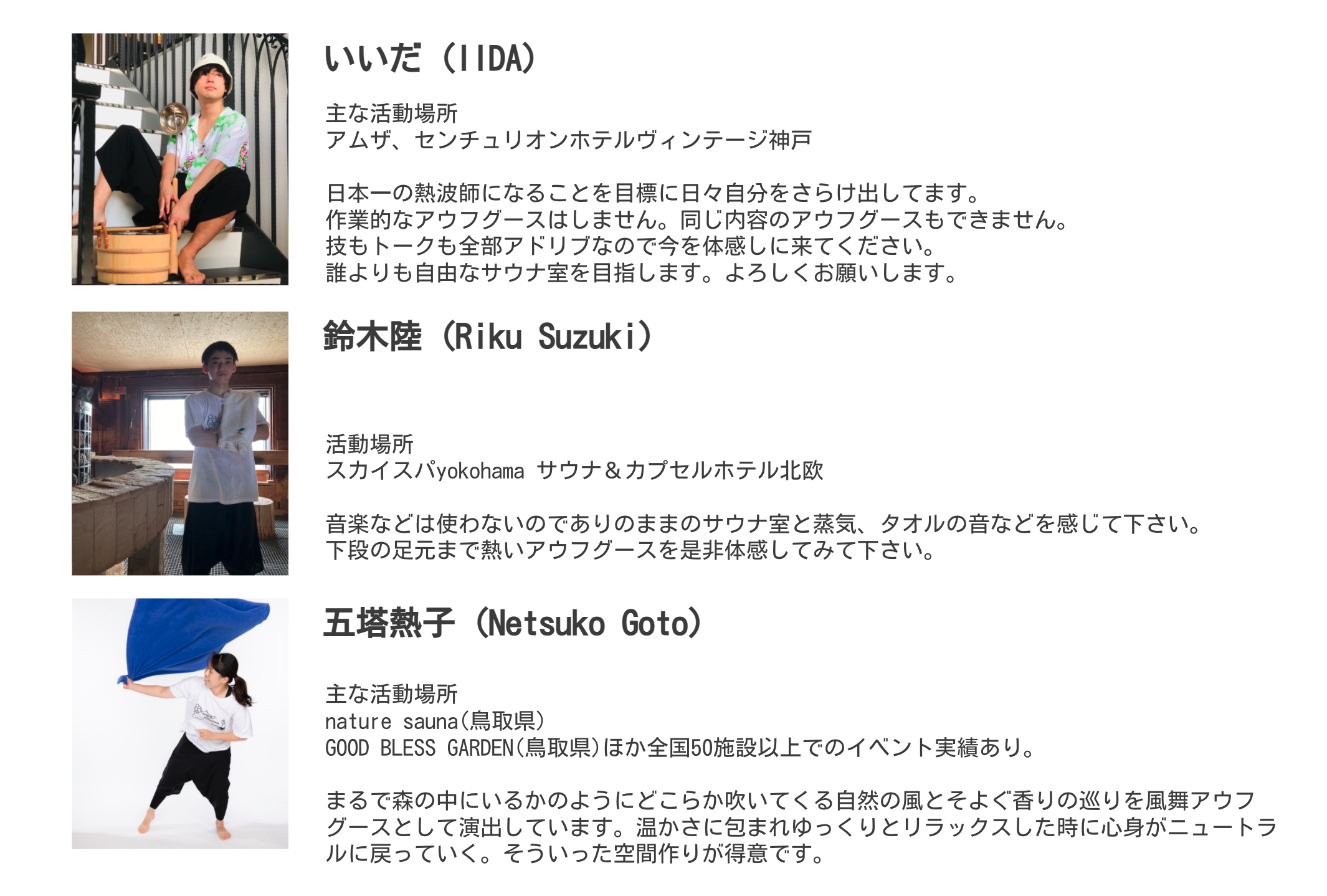 サウナーの皆さんに一流熱波師によるアウフグースによって非日常の「ととのう」を堪能していただきたいです。熱波師をよくご存知のかたは、参加予定熱波師をご覧いただければ、一度は聞いた事ある有名熱波師ばかりだと思います。アウフグースを受けたことがない方も今回のアウフグースフェスをきっかけにアウフグースの魅力を知っていただけたらと思います。温かいご支援のほどよろしくお願い致します。
