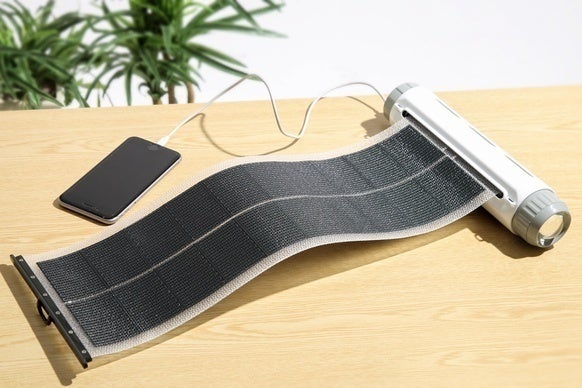 この【tovos】は巻き取り式で本体にくるくる巻ける超薄型ソーラーパネルを搭載