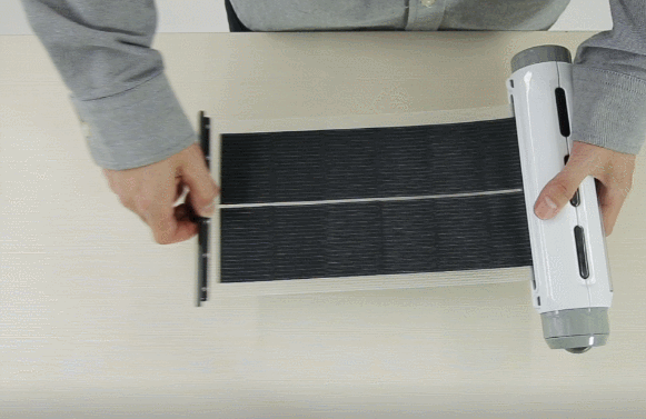 しています。引き出すと長さ43cm、幅14cmの大型ソーラーパネルが現れます。