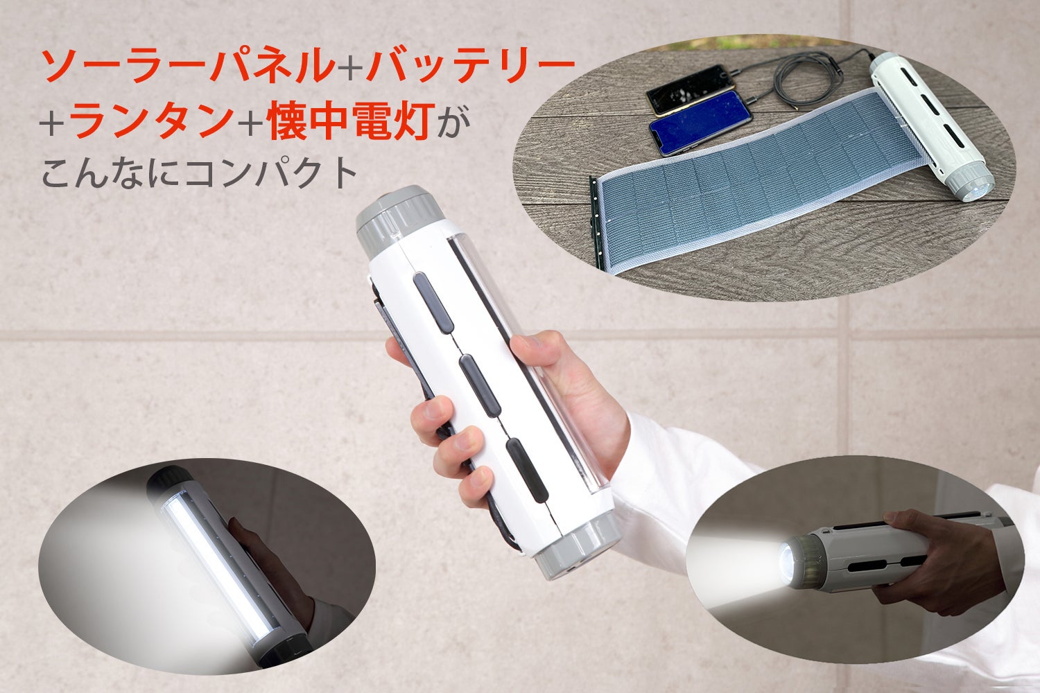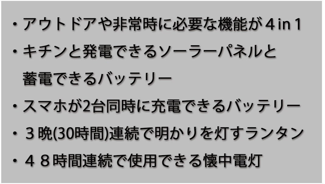 害時に必要な「ライト」、「太陽光発電装置」、「携帯バッテリー」の機能を