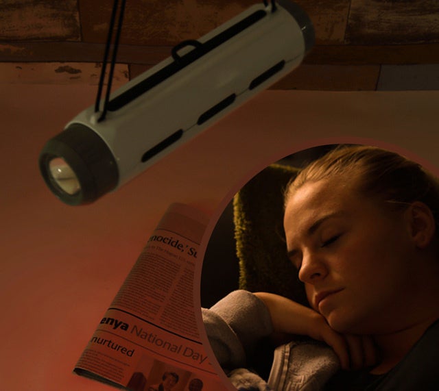 Q:ソーラーパネルは蛍光灯の光や、避難場所の体育館の照明などの