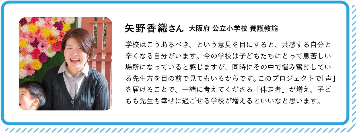 大人も子どもも大切にされる学校をつくりたい。教職員の声を社会に届けるこのプロジェクトの目指すゴールは、教職員のみならず、その先にいる子どもたちが、自分の意見を大切なものだと感じ、自分の力を信じて、未来に希望を持って学び育っていける学校にしていくことです。
