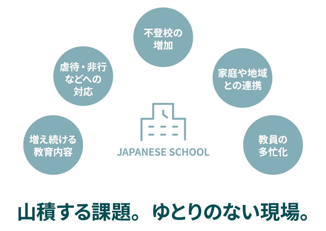 ゆとりのない学校現場には今、増え続ける教育内容への対応や虐待・非行・不登校への対応、家庭や地域との連携、教員の多忙化など、さまざまな課題が山積しています。