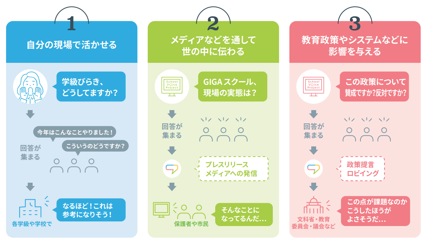 集まったアンケートの活かし方としては、「自分の現場で参考にする」「メディアを通して、広く世の中に伝わるようにする」「議会や教育行政機関に届け、教育政策や仕組みづくりの議論に反映されるよう働きかける」というように大きく3つのパターンがあると考えています。