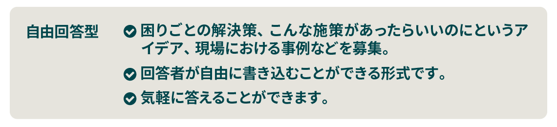 ネット上で気軽にアンケートに答えられる仕組みをつくり、現場の教職員の方から、さまざまなトピックついての意見や思いを集めます。そしてそれを、現場で活かせるようにまとめて発信したり、世の中や行政に届けるアクションを起こします。