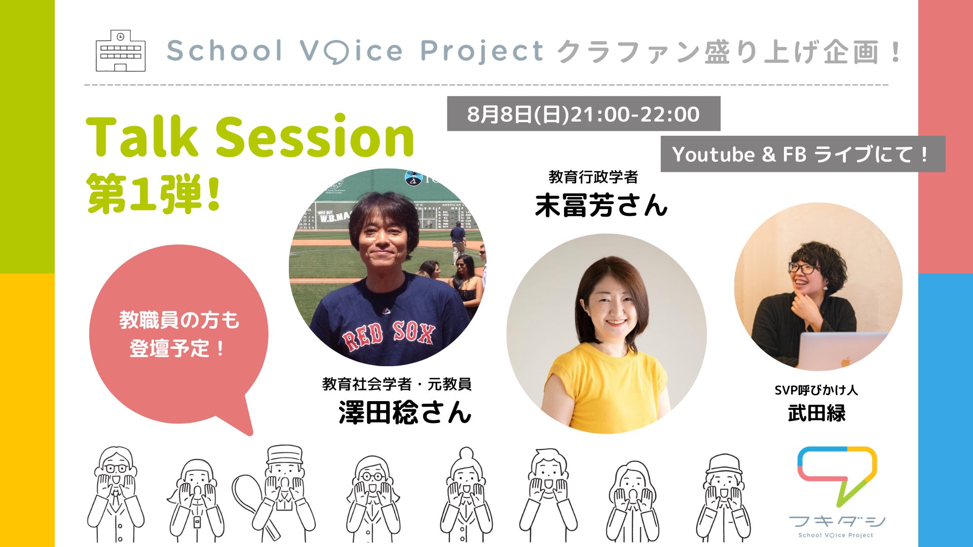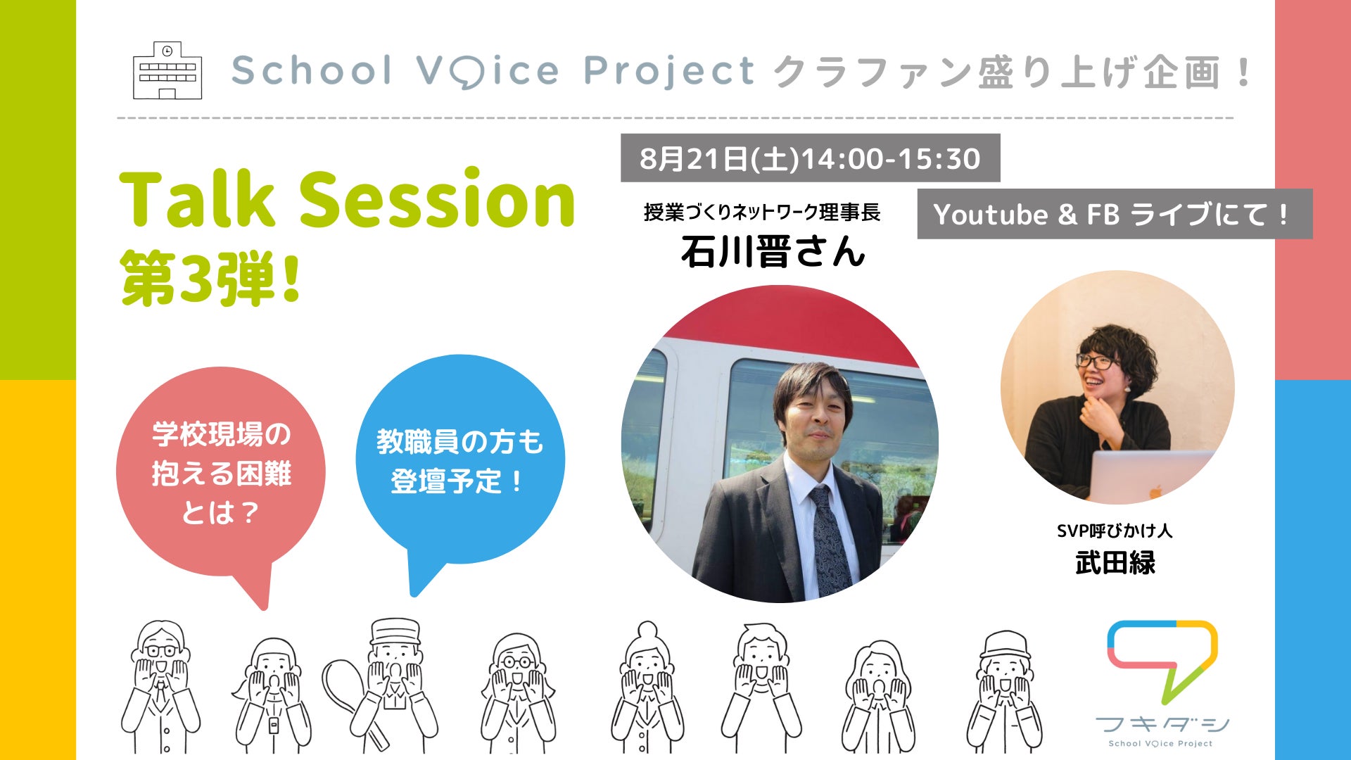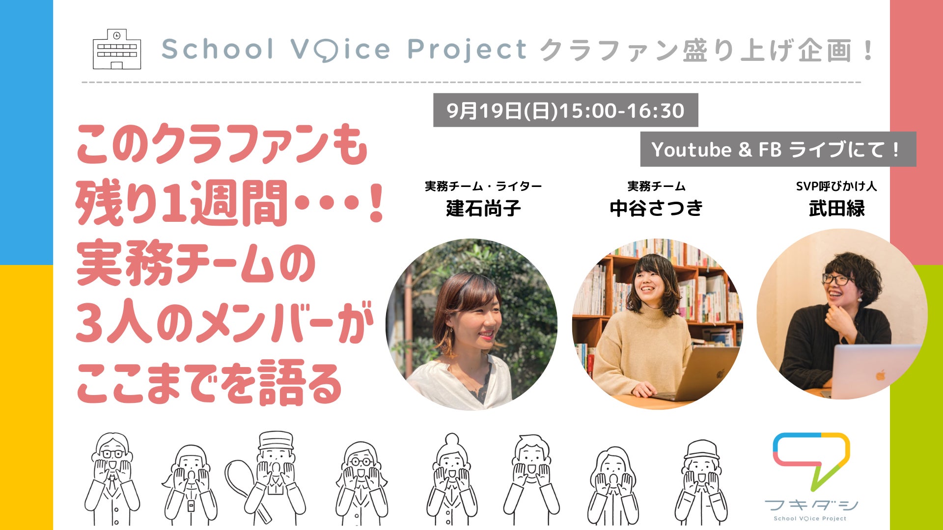 School Voice Projectの事務局を担う、実務チームメンバー、武田緑、中谷さつき、建石尚子の3人が、クラウドファンディング実施期間中にやってきたことや、届いている声、これから『フキダシ』をどんなプラットフォームにしていきたいのか・・・などをざっくばらんにお話しします。