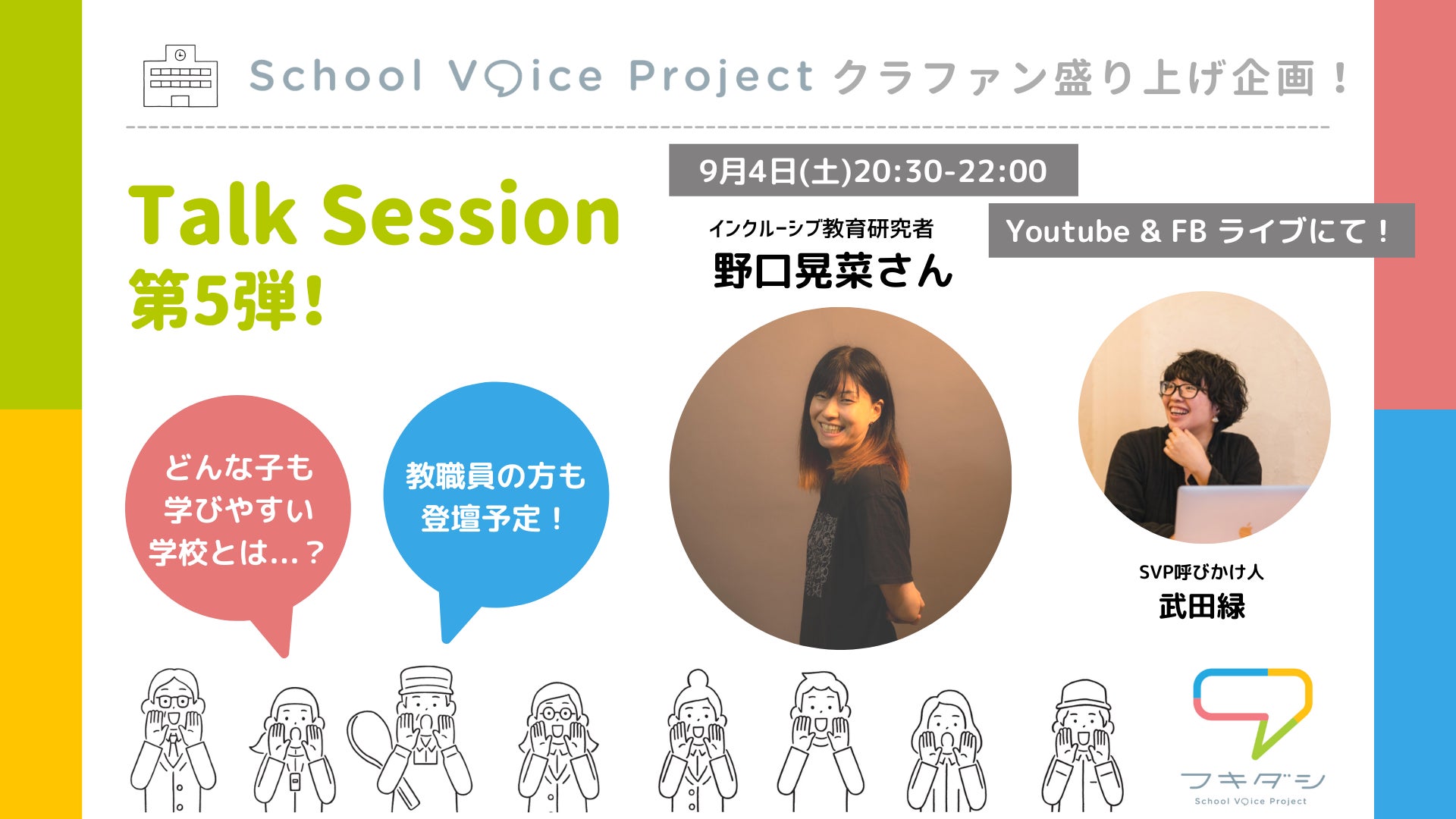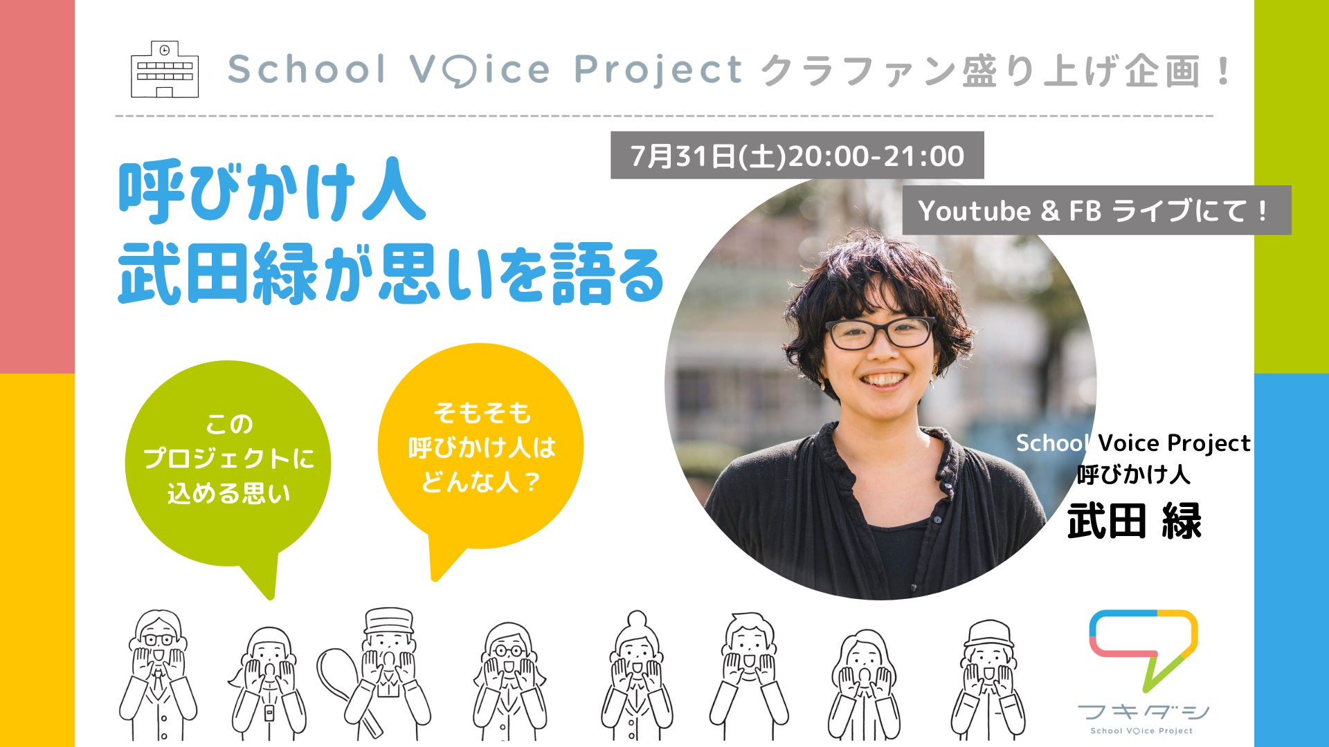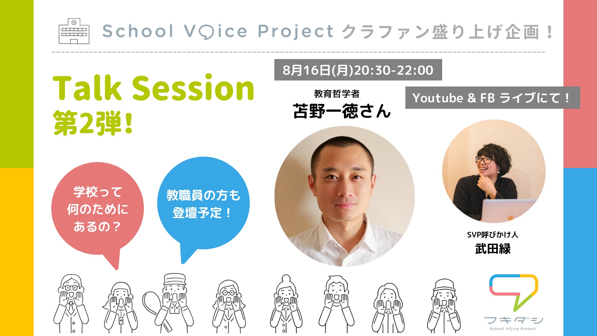 School Voice Projectの事務局を担う、実務チームメンバー、武田緑、中谷さつき、建石尚子の3人が、クラウドファンディング実施期間中にやってきたことや、届いている声、これから『フキダシ』をどんなプラットフォームにしていきたいのか・・・などをざっくばらんにお話しします。