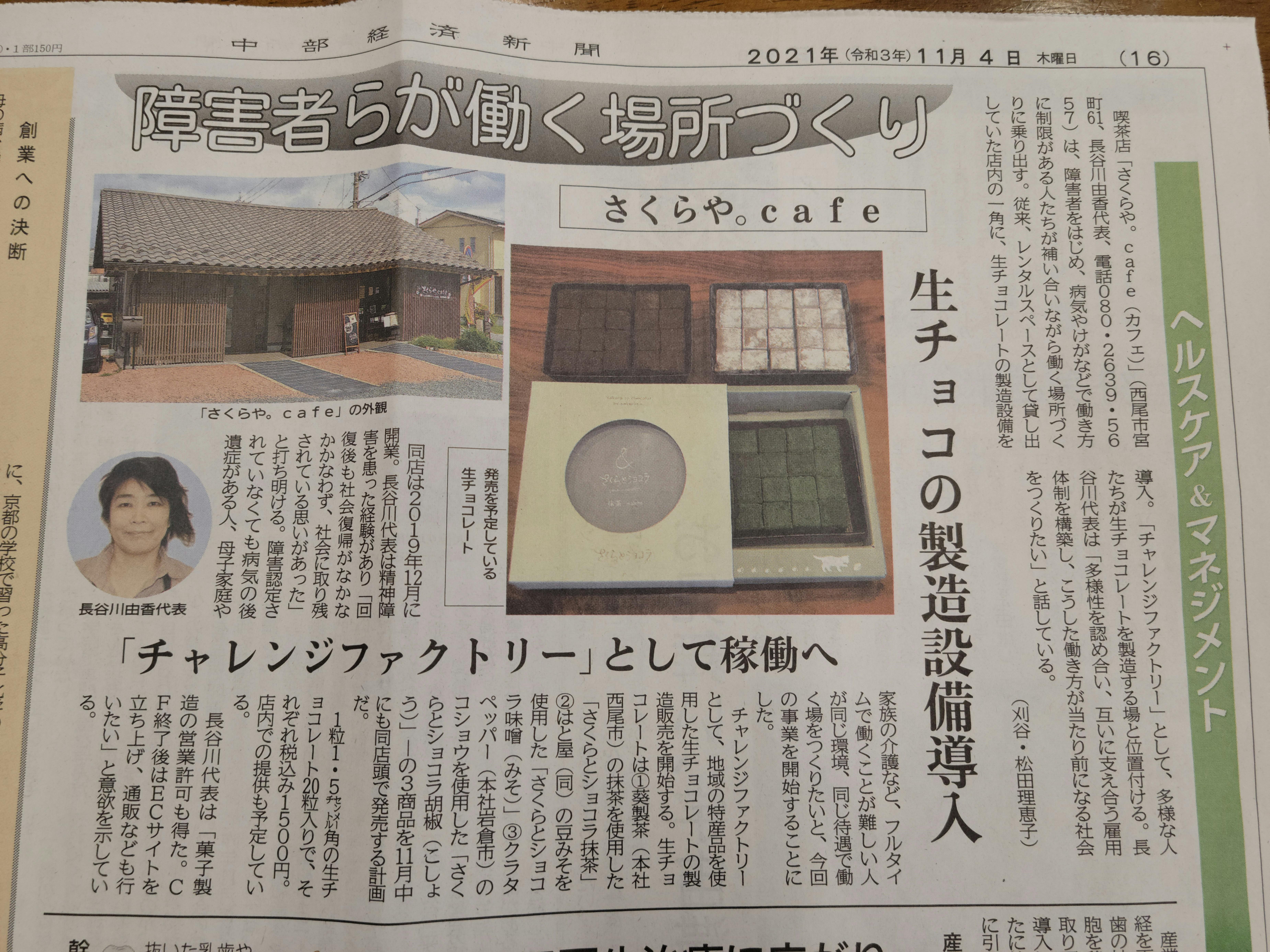 2021/11/04 15:32応援ありがとうございます。本日11月4日付 中部経済新聞にさくらや。caféの記事が大きく掲載されました。ここからスタートです。引き続き応援よろしくお願いします。 もっと見る
