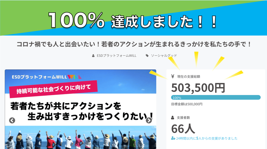 2021/10/23 12:20こんにちは!ESDプラットフォームWILL事務局です。プロジェクト終了まで少し時間を残し、目標額の100%を達成しました!!ご支援、ご協力いただいた皆様、本当にありがとうございました!はじめての試みで不安も多かったのですが、支えてくださる皆様に励まされながら進めることができました。改めて、たくさんの方の支えがあって活動ができているということを実感することができました。現在、WILLでは秋から冬にかけてのプログラムづくりや季刊WILLの発行準備を進めています。今後も「持続可能な社会」のあり方を問いながら活動を続けていきたいと思います。プロジェクト終了後、支援者の皆様へ順次リターンのご対応をさせていただきます。引き続き、ESDプラットフォームWILLをどうぞよろしくお願いいたします! もっと見る
