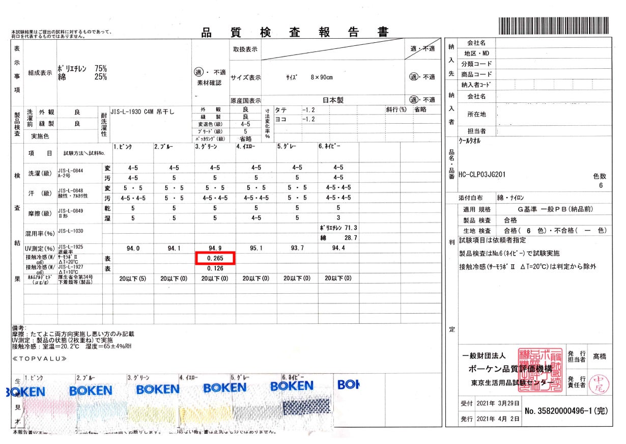 冷感度約試験結果【出典:一般財団法人 ボーケン品質評価機構】