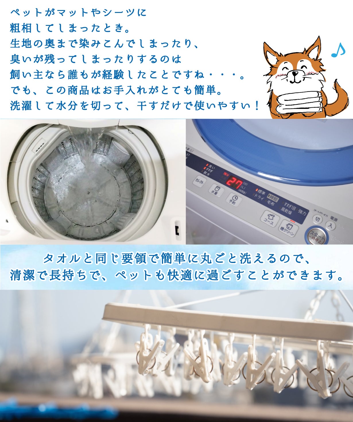 洗濯機で丸洗いできるから、お手入れもラク!いつでも清潔です。