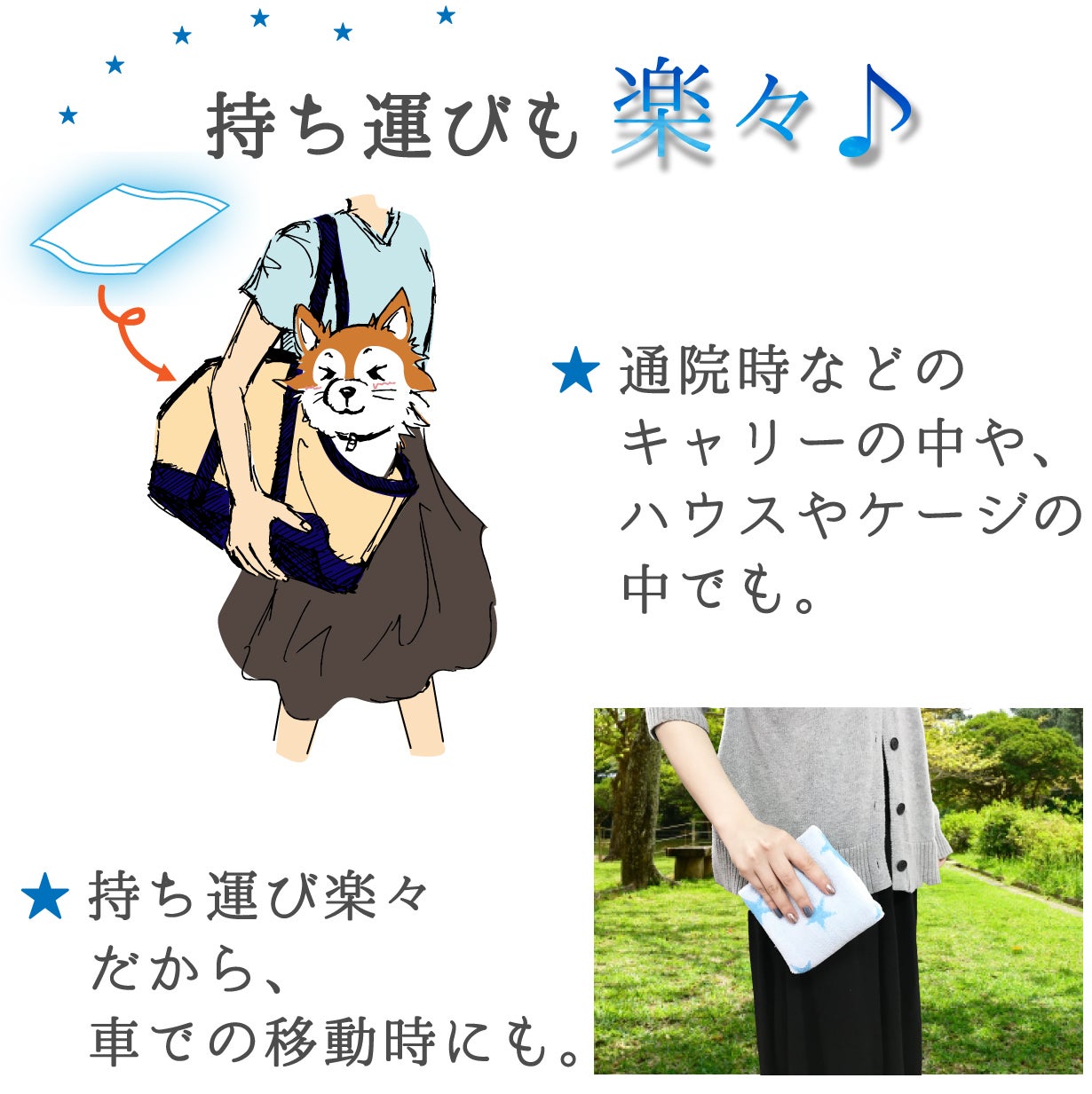 お出かけの際に車の座席に敷いたり、カフェやお友達宅のベンチや床にサッと敷いて愛犬のお気に入りスポットに。タオルメーカーが開発したロングセラー素材、魔法のクール糸®によるひんやり感で、暑い夏も心地よいスペースをお届けします。