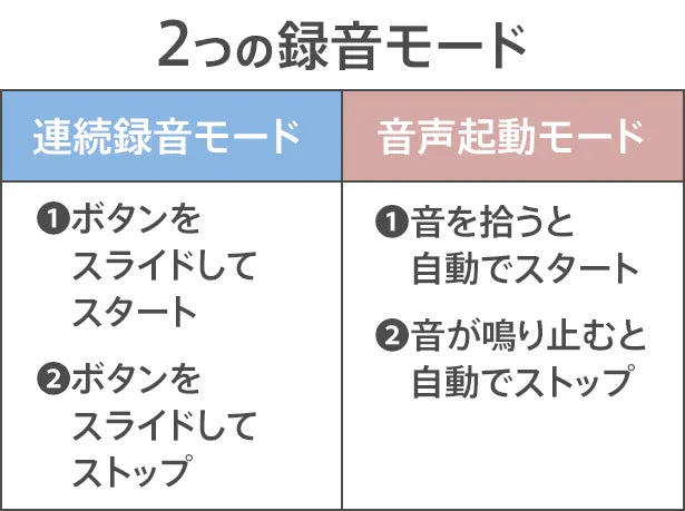 ワンタッチで簡単に録音スタートできるのはもちろんのこと、音を感知すると自動で録音がスタートするモードを選べます。