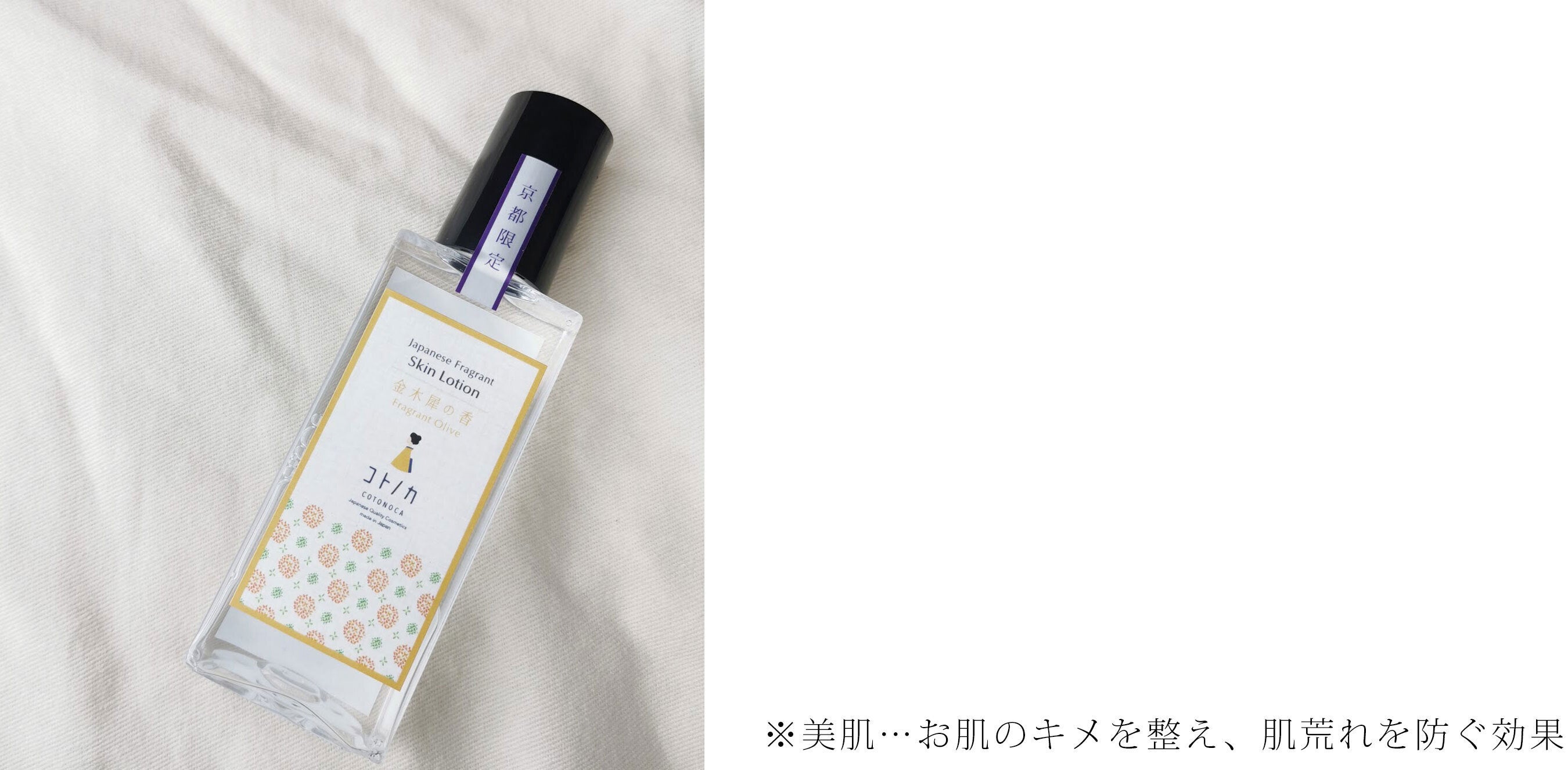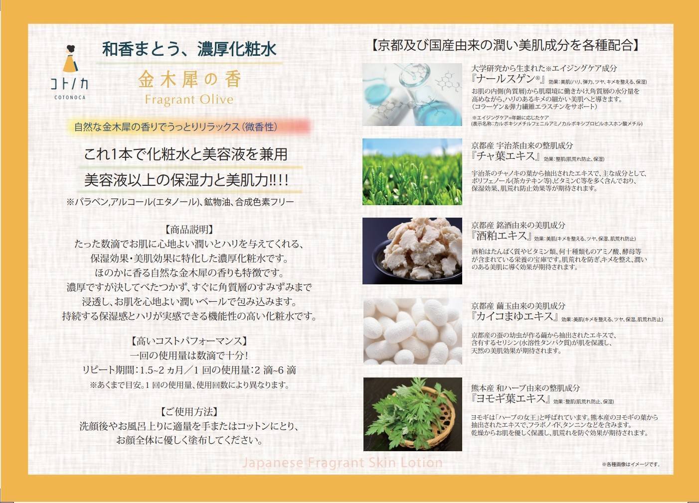 宇治茶由来成分(チャ葉エキス)や繭玉由来成分(カイコまゆエキス)、酒かすエキスなど京都産の「ええもん」をふんだんに使い、ヨモギ葉エキスや、大学研究から生まれた保湿・エイジングケア成分も配合しました。これ1本で化粧水も美容液も兼ねる濃厚化粧水です。そして金木犀の香りにもこだわり、使うたびにリラックスできるような、まるで顔に金木犀を浴びたかのような魅惑の香りに仕上げました。