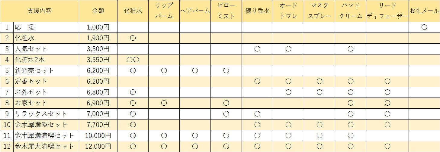 今回のクラウドファンディングのリターンとして、コトノカ自慢のまるで本物の金木犀かのような香りを追求した金木犀シリーズをお届け致します。通販や実際に店頭でお買い上げくださるよりお得にご用意させて頂きました。もちろん、送料はこちらで負担させて頂きます!