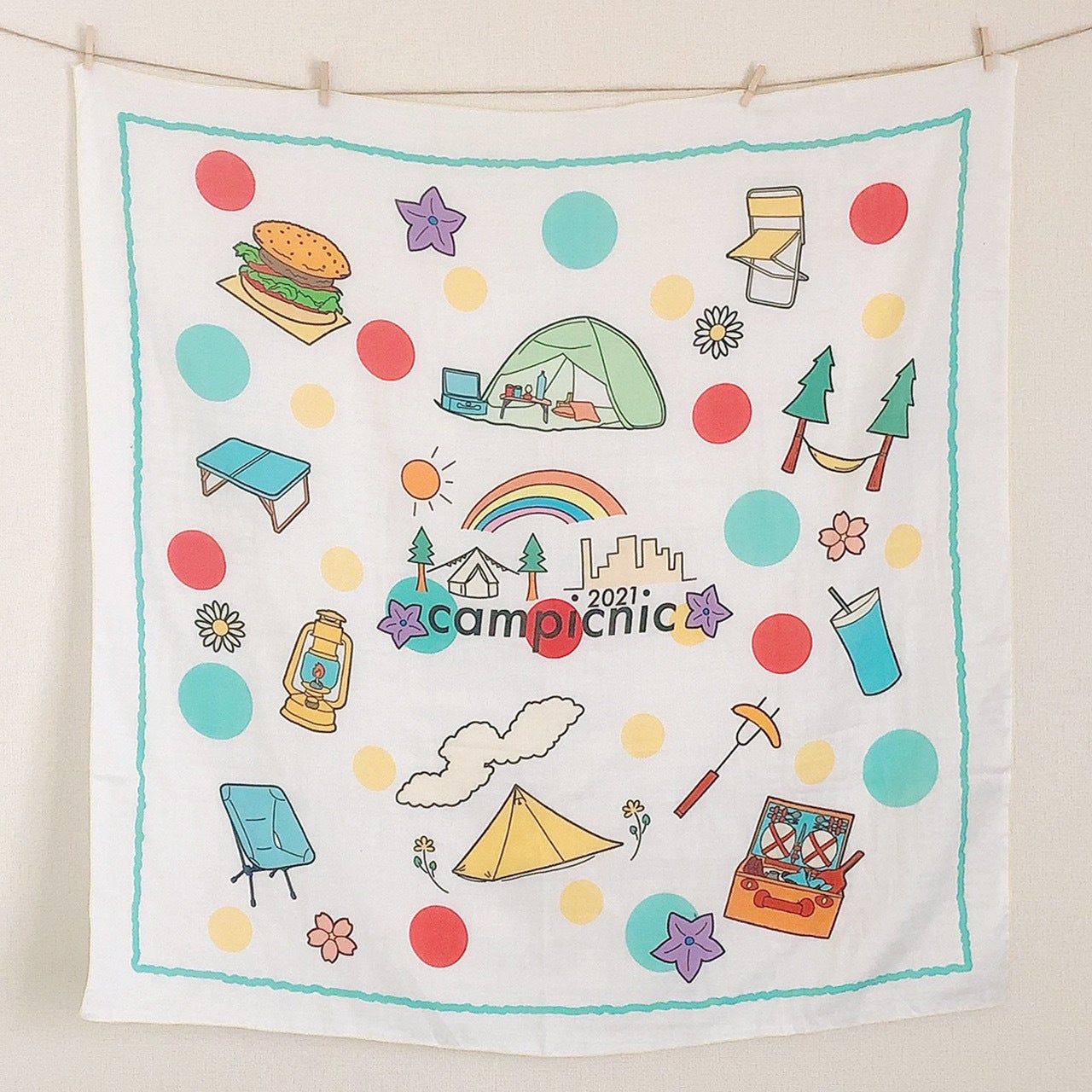 ルンルンでソトアソビにでかけてほしくて、大判風呂敷を準備しました。イラストは会場に漂うウキウキしたかわいい雰囲気を表現したつもりです