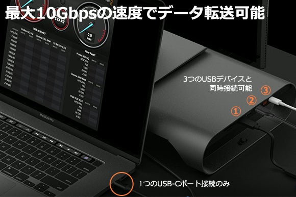 3つのUSBポートはそれぞれ最大10Gbpsの転送速度を可能としています。