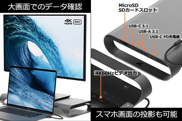 ◉MicroSD・SDカードスロットや4K60Hzビデオ出力、更にはスマホ画面の投影にも対応しているので、大画面でのデータ確認も簡単!