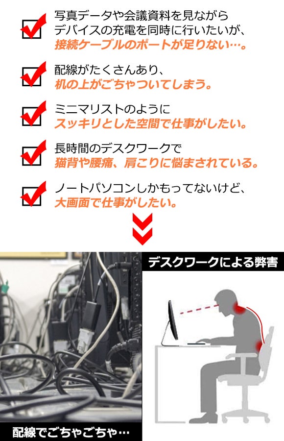 ノートPC、大画面モニター、スマートフォン、その他複数のデバイスを机上に乗せて作業すると、それぞれの配線がこちゃつきがちに…
