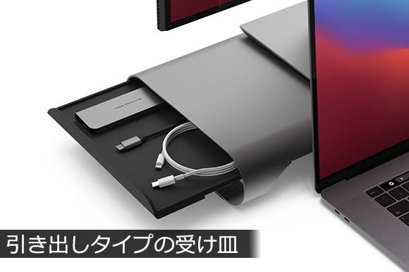スタンドの左側には引き出しタイプの受け皿がついているので、デスクワーク時によく使用するペンやメモ帳、付箋などをしまっておくことができます。