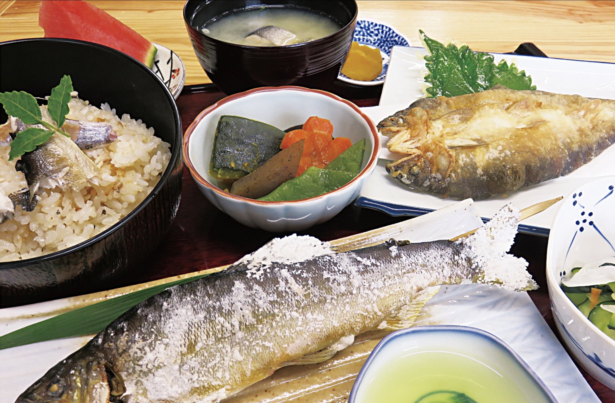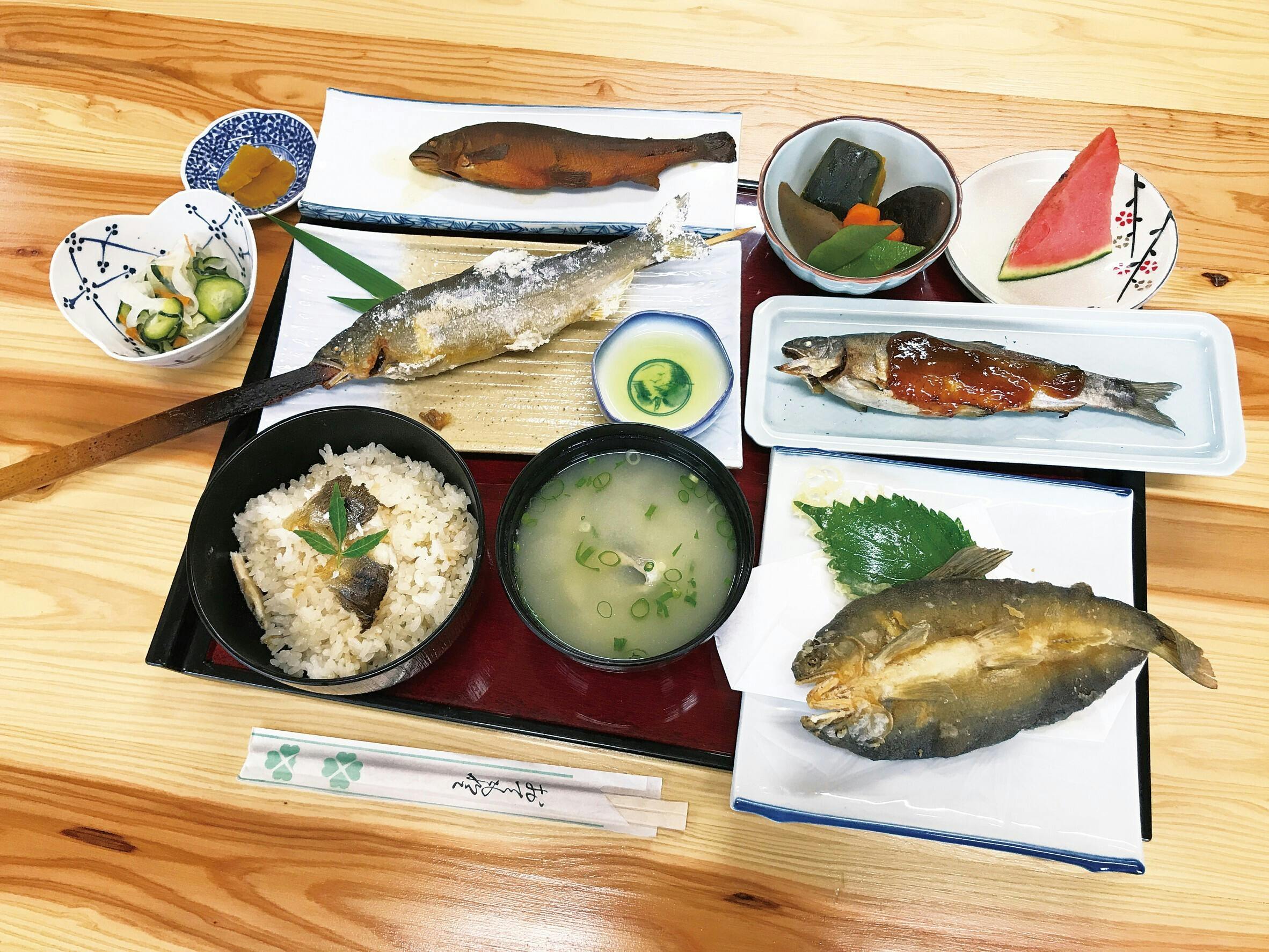 『食処さかもと鮎やな』は、坂本町の「豊かな自然×高齢者」という発想をもとに、坂本町全住民で立ち上げた、鮎料理専門店です。食材は全て地元で採れたものを使用し、従業員には地元の高齢者を多く雇用しています。地産地消を推進するとともに、高齢者の雇用と生き甲斐を生み出す場となっています。