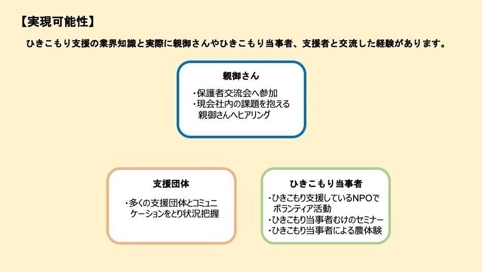 私はひきこもり当事者を抱える親御さん同士が情報共有できるコミュニティを作りたいと考えています!多くの支援方法があり、様々な支援を受けている親御さんが全国にいますが、親御さん同士の繋がりはほとんどありません。そのためひきこもり当事者を抱える親御さんにフォーカスして、いつでも情報をキャッチアップできる社会に変えていきたいです!