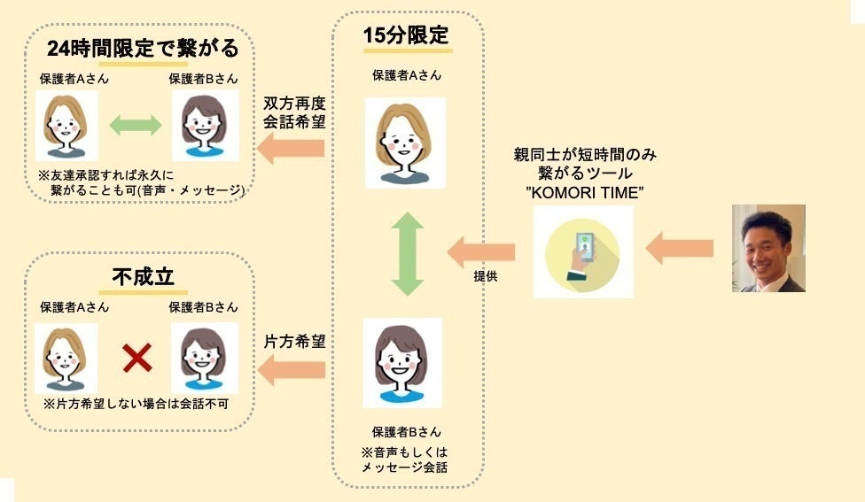 上記課題を解決していくために私は【短時間のみ繋がり会話できる音声型SNS】を提供していきたいと考えています。年齢や性別等である程度絞り込みをした後、同じくひきこもりを抱える親御さんとマッチングします。最初にお話しできる時間は15分のみ。15分経ったタイミングで引き続き相手と会話希望か確認します。お互い希望すれば24時間限定で繋がる仕組みです。逆に片方が希望しない場合はそこで終了となります。