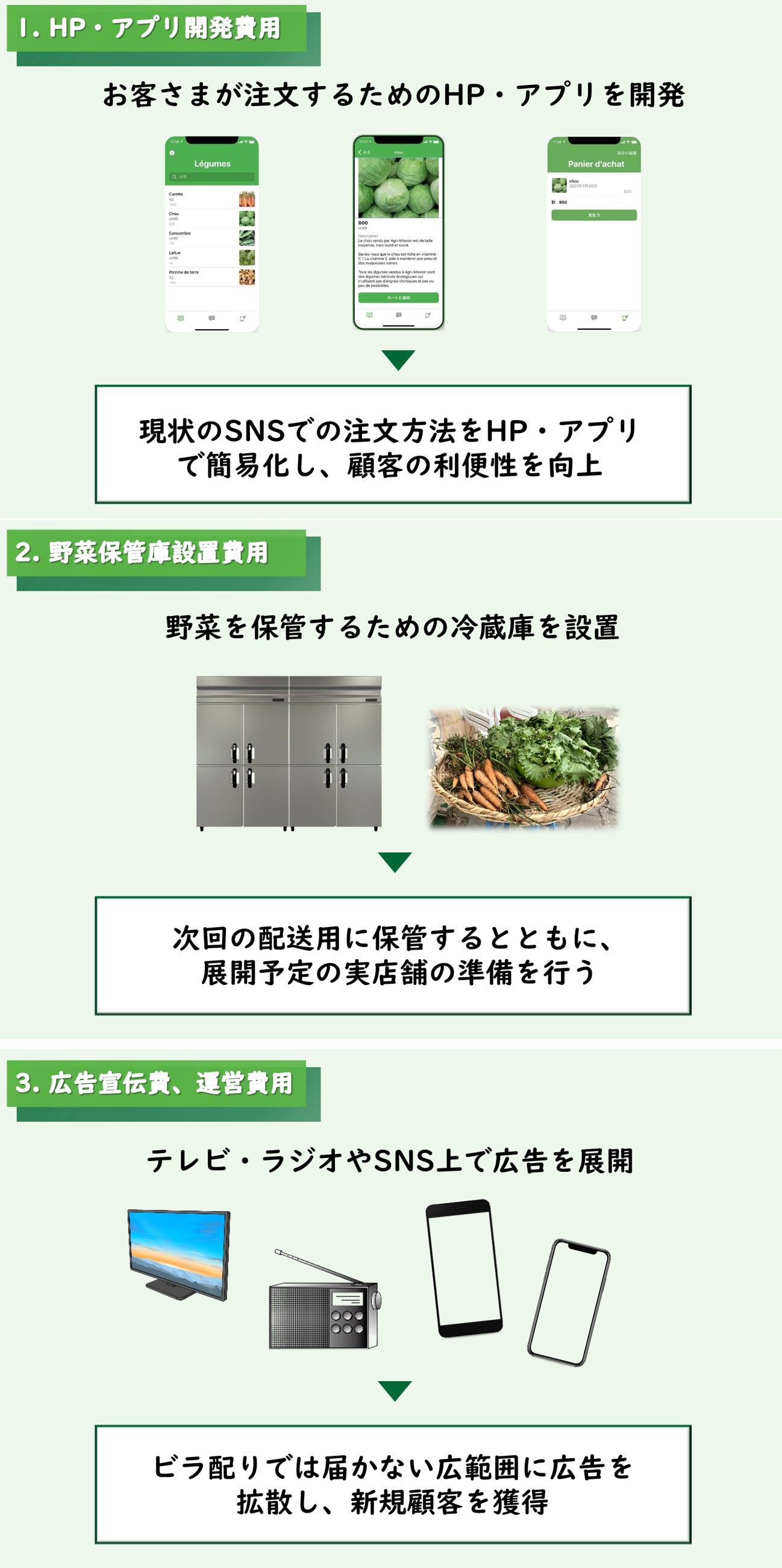 今回は赤枠の『お客さま用HP・アプリの開発』、『各メディア・SNSでの広告』、『野菜保管用の冷蔵庫設置』について、皆さまからご支援いただき実現したいと考えています。